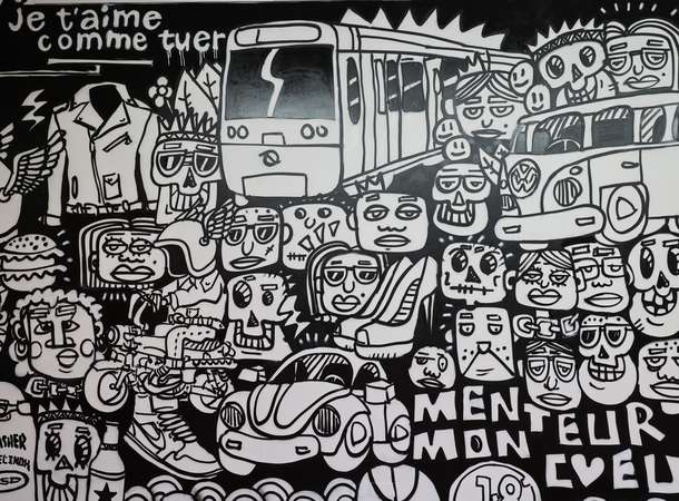 Kofoh fait sa première expo à la Galerie Rêve Lucide jusqu’au 31 mars. Ses œuvres entre personnages multiples et graff sauvage, aux couleurs vives, sont exposées dans ce jeune espace de Saint-Leu. Kofoh a commencé à tagger dans les transports en commun, la nuit : « ça fait longtemps que je fais du graffiti, j’ai commencé dans les années 1990 et même plus précisément, c’était du graffiti vandale quoi. Sur tous les supports, la rue, les roulants, ce qu’on appelle les roulants ce sont les trains, les métros… »